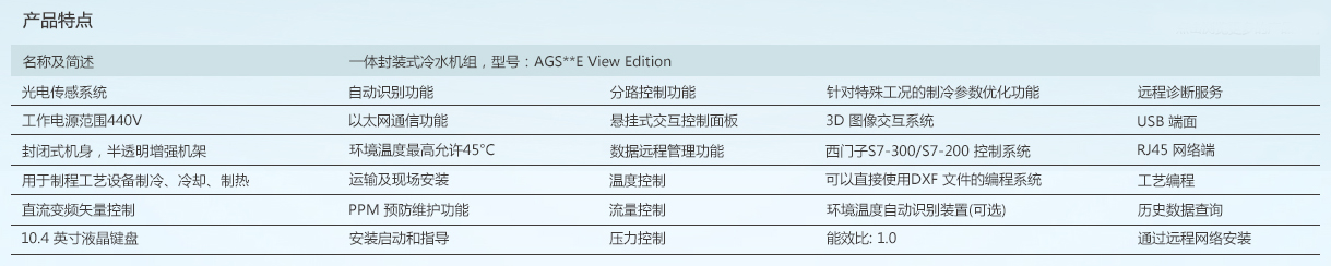 为电子、半导体、生物、医疗、化工、光通信等领域用户,提供专用的制冷设备和整体技术方案,无论是机器外观还是技术功能,都将完全适应用户的应用要求,制冷量最大10MW,搭载创新的直流驱动技术,和独有的电子能量匹配技术,在零下-48℃至+140℃的范围内,从18.0MΩ的纯水至油、气体等不同介质,将提供用户满意的应用体验,并帮助用户优化能源的应用成本。